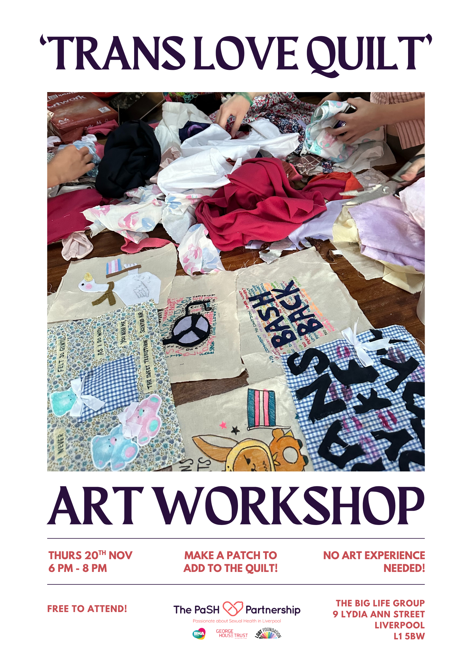 Trans Love Quilt Art Workshop Decorative background image for the post: Aliquam tincidunt Trans Love Quilt Art Workshop 20 November, 6:00 pm - 8:00 pm The Big Life Group 9 Lydia Ann Street, Liverpool